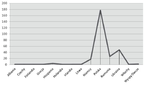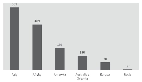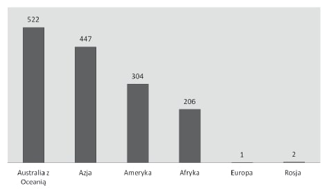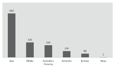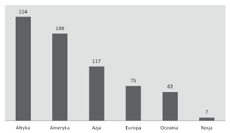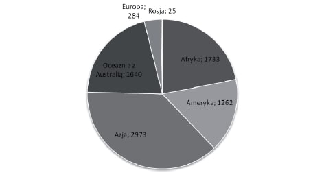 W zespole eksponatów wydzielono też zbiór europejski, który liczy 284 egzemplarze. W artykule oddzielnie została potraktowana Federacja Rosyjska ze względu na jej rozległość terytorialną, obejmującą dwa kontynenty. Jak dotąd jest ona skromnie reprezentowana w zbiorach muzeum (25 muzealiów10). Na wykresie 2. pokazano, jak rozkładają się zebrane przedmioty.
