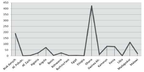 b) Zbiory afrykańskie obejmują 1733 eksponaty etnograficzne i są drugim co do liczebności kontynentem. Pośród 33 wymienionych w spisie państw Czarnego Lądu niektóre kraje wyraźnie wybijają się liczbą zgromadzonych zasobów wystawienniczych, co ilustrują poniższe wykresy.