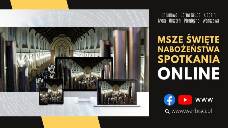 W związku z obecnymi ograniczeniami jeszcze większą rolę odgrywa Internet. Nasze parafie w Chludowie, Kleosinie k. Białegostoku, Nysie, Olsztynie, Pieniężnie, Warszawie (wkrótce dołączy także Dom Misyjny w Górnej Grupie) transmitują Mszę świętą czy nabożeństwa z wykorzystaniem Facebooka lub platformy YouTube (zob. SZCZEGÓŁY). Codziennie jest też możliwość uczestniczenia tą drogą we Mszy świętej sprawowanej w języku wietnamskim. Na stronie naszej parafii w Nysie jest podgląd kościoła non-stop. Dzięki temu można adorować Najświętszy Sakrament w wyznaczonych godzinach i otrzymać błogosławieństwo. Od poniedziałku do piątku o 7:45 można wirtualnie napić się kawy z o. Edwardem Konkolem SVD i zadać mu pytania na dowolny temat. Transmisję przeprowadza Stowarzyszenie Pomocy Rodzinie "Droga" z Białegostoku.