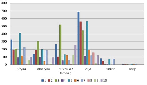 Wykres 5. Liczba sprzętów gospodarstwa domowegozebranych z poszczególnych kontynentów