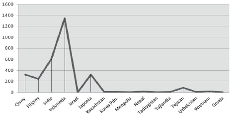 Wykres 8. Liczba eksponatów w zbiorze Azja z uwzględnieniem poszczególnych państw