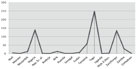 b) Zbiory afrykańskie obejmują 1733 eksponaty etnograficzne i są drugim co do liczebności kontynentem. Pośród 33 wymienionych w spisie państw Czarnego Lądu niektóre kraje wyraźnie wybijają się liczbą zgromadzonych zasobów wystawienniczych, co ilustrują poniższe wykresy.