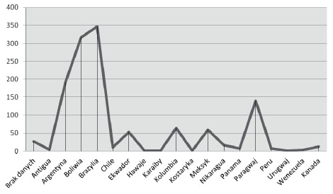 Wykres 12. Liczba eksponatów w zbiorze Ameryka z uwzględnieniem poszczególnych państw