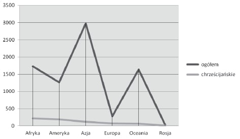 Wykres ilustruje dane liczbowe wszystkich eksponatów zgromadzonych w muzeum (ciemna linia) oraz przedmiotów, będących świadectwem przyjętego chrześcijaństwa (linia jasna). Łatwo zauważyć, że największa rozbieżność między ilością zebranych eksponatów w ogóle a chrześcijańskimi dewocjonaliami zaznacza się w Azji, najmniejsza w Europie. Ta proporcja zapewne nikogo nie dziwi.