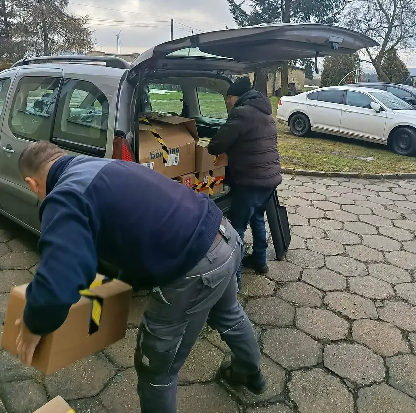 O. Wiesław Dudar SVD z pracownikiem Szkoły Podstawowej w Krowiarkach ładują zebrane przybory szkolne (fot. Ewelina Marker)