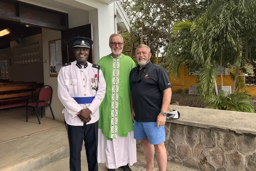 Nadinspektor policji na Nevis (w mundurze), który gra na organach podczas Mszy św. Jest ewangelikiem. Obok o. Robert Ratajczak SVD oraz turysta z USA (fot. archiwum Roberta Ratajczaka)
